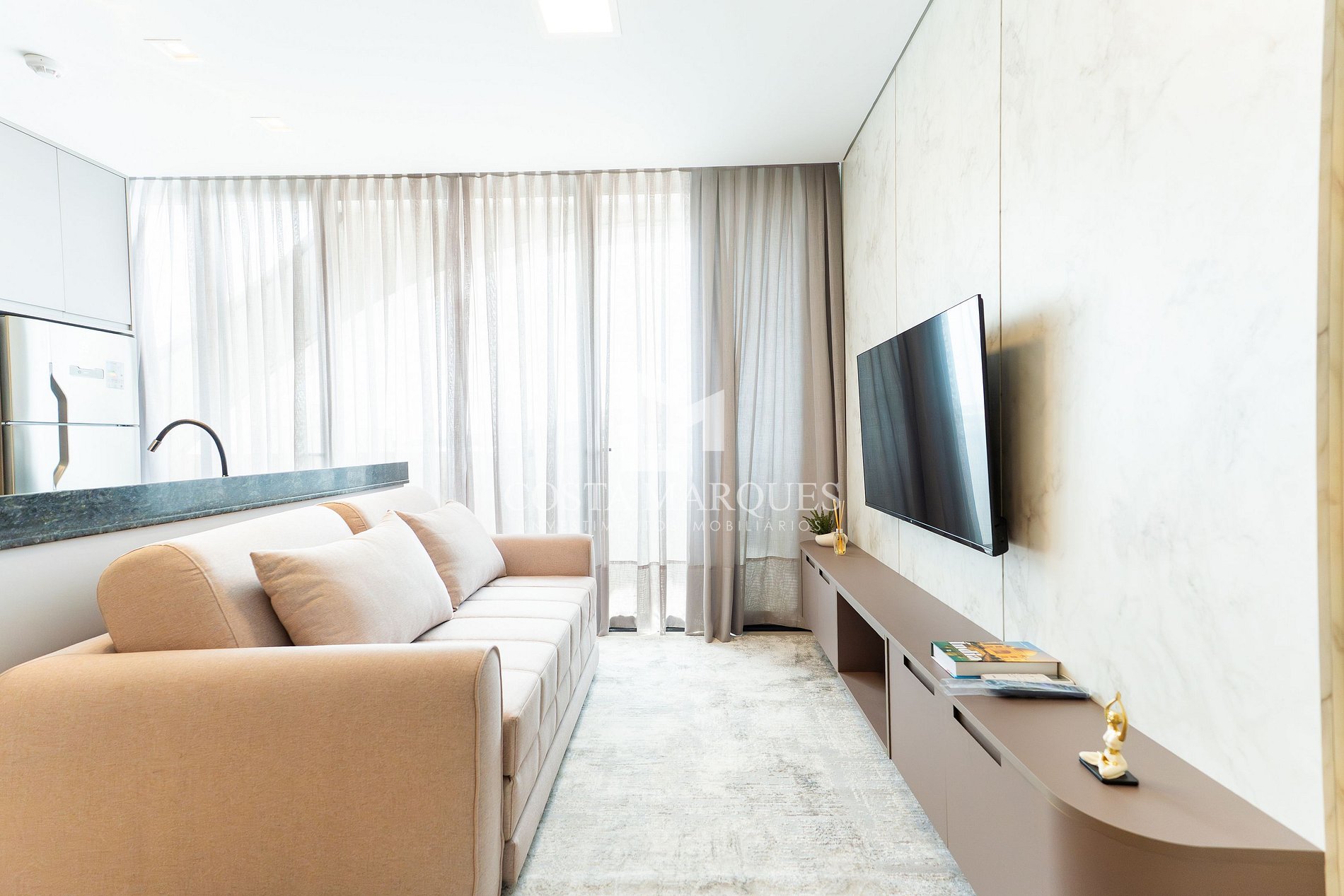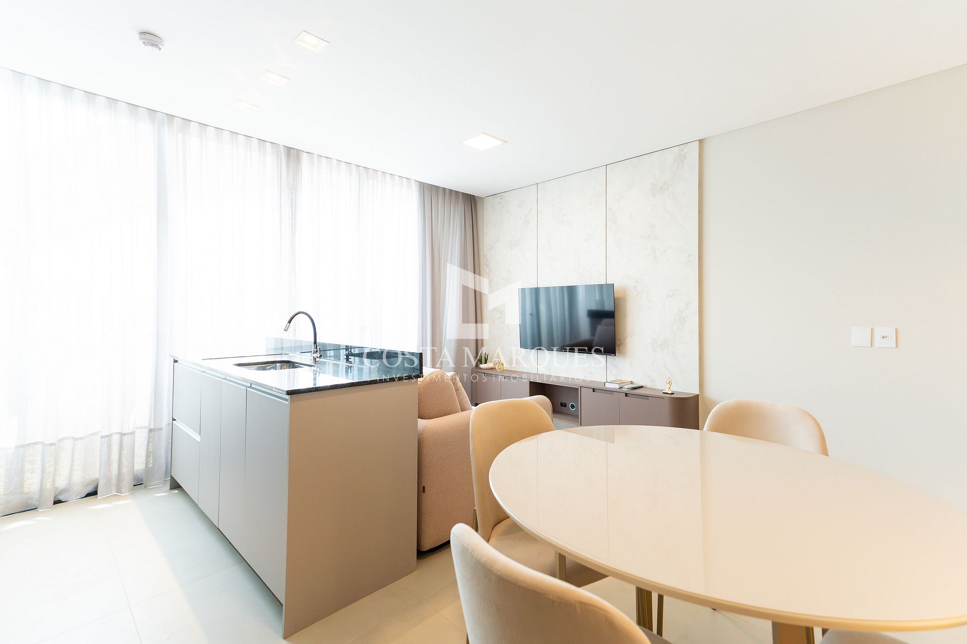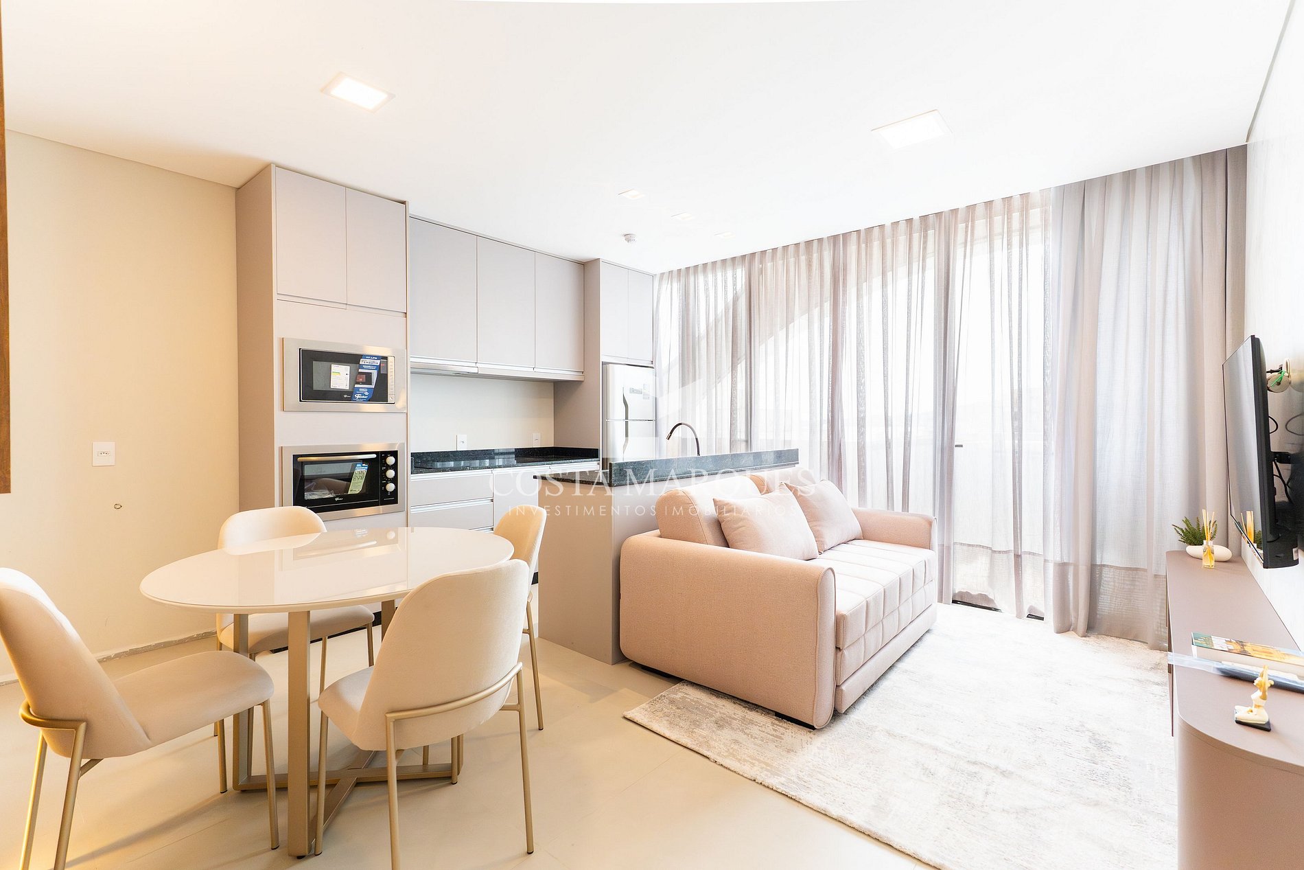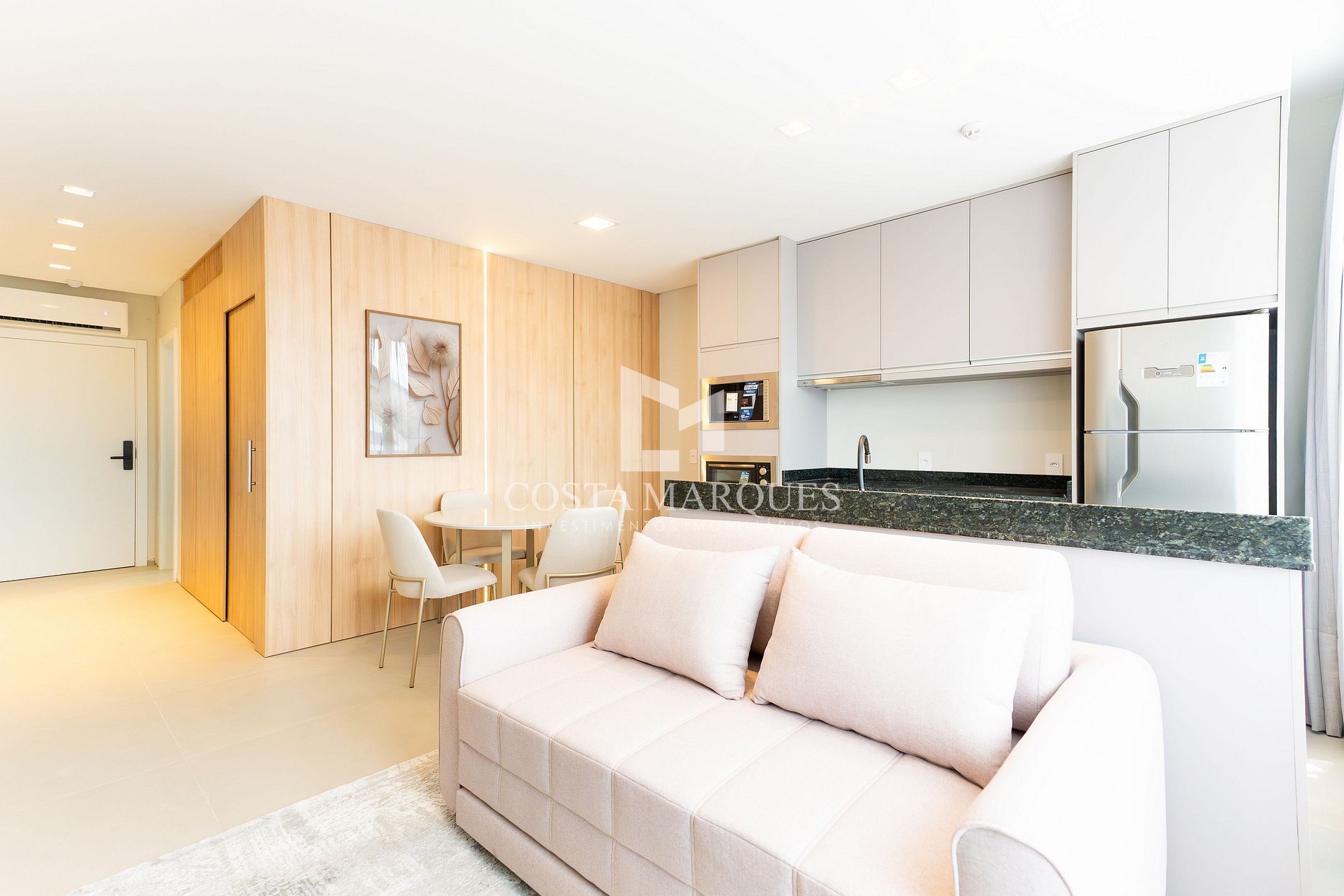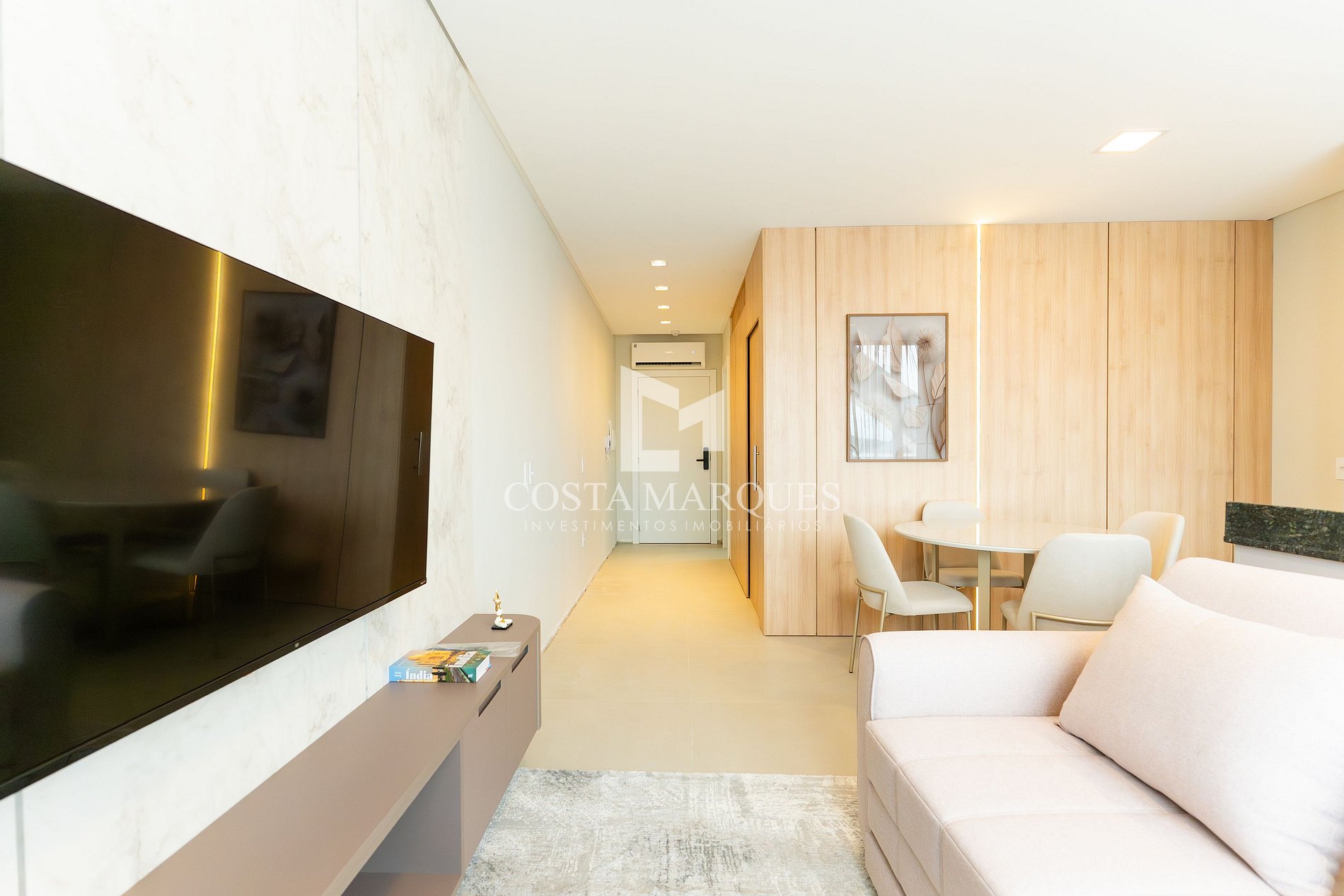 Sala de estar com sofá cama, climatizado e jantar integradas.