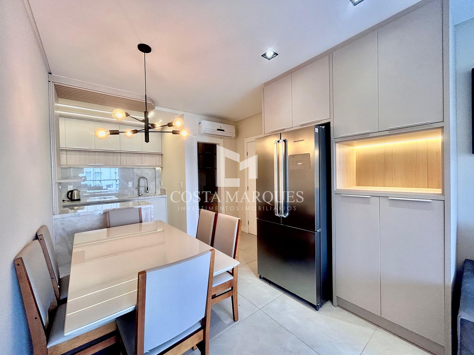 Cozinha completa: Cozinha americana integrada à sala, equipada com fogão, geladeira, utensílios de cozinha, cafeteira e mesa de jantar, ideal para preparar refeições em casa.
