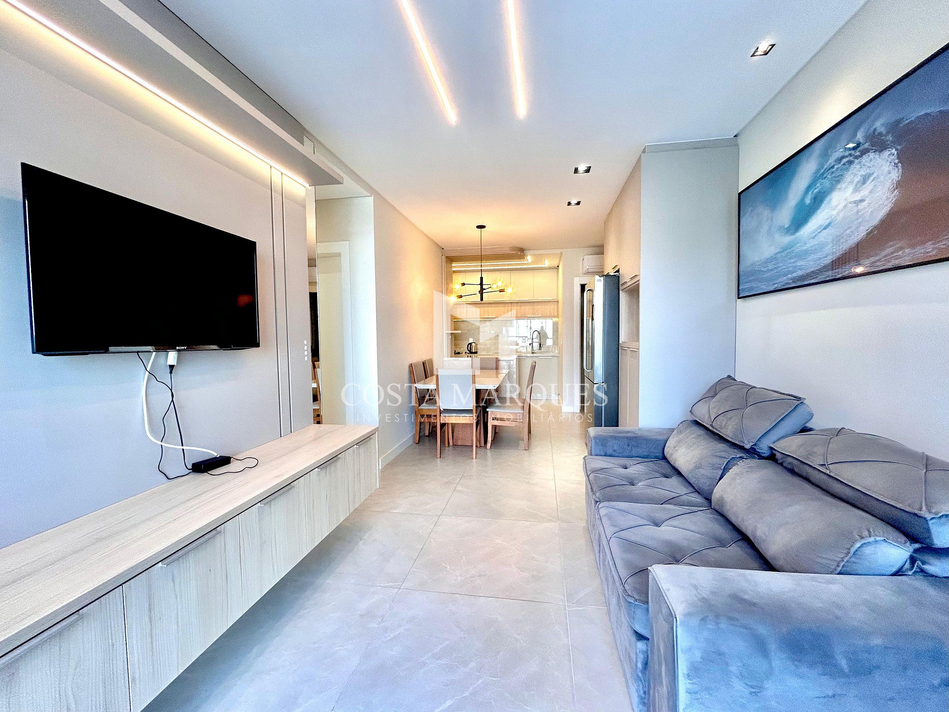 Sala de estar moderna e confortável: Ambiente agradável com sofá confortável, TV de tela plana e acesso à varanda, proporcionando momentos de relaxamento em grupo.