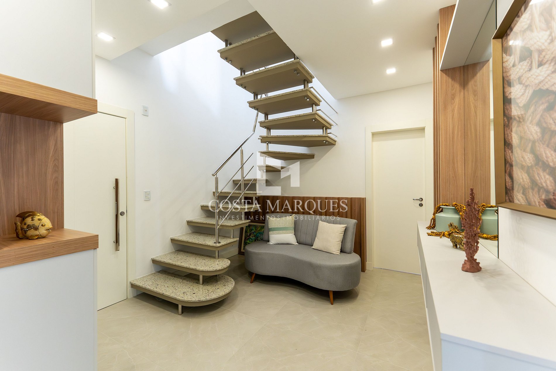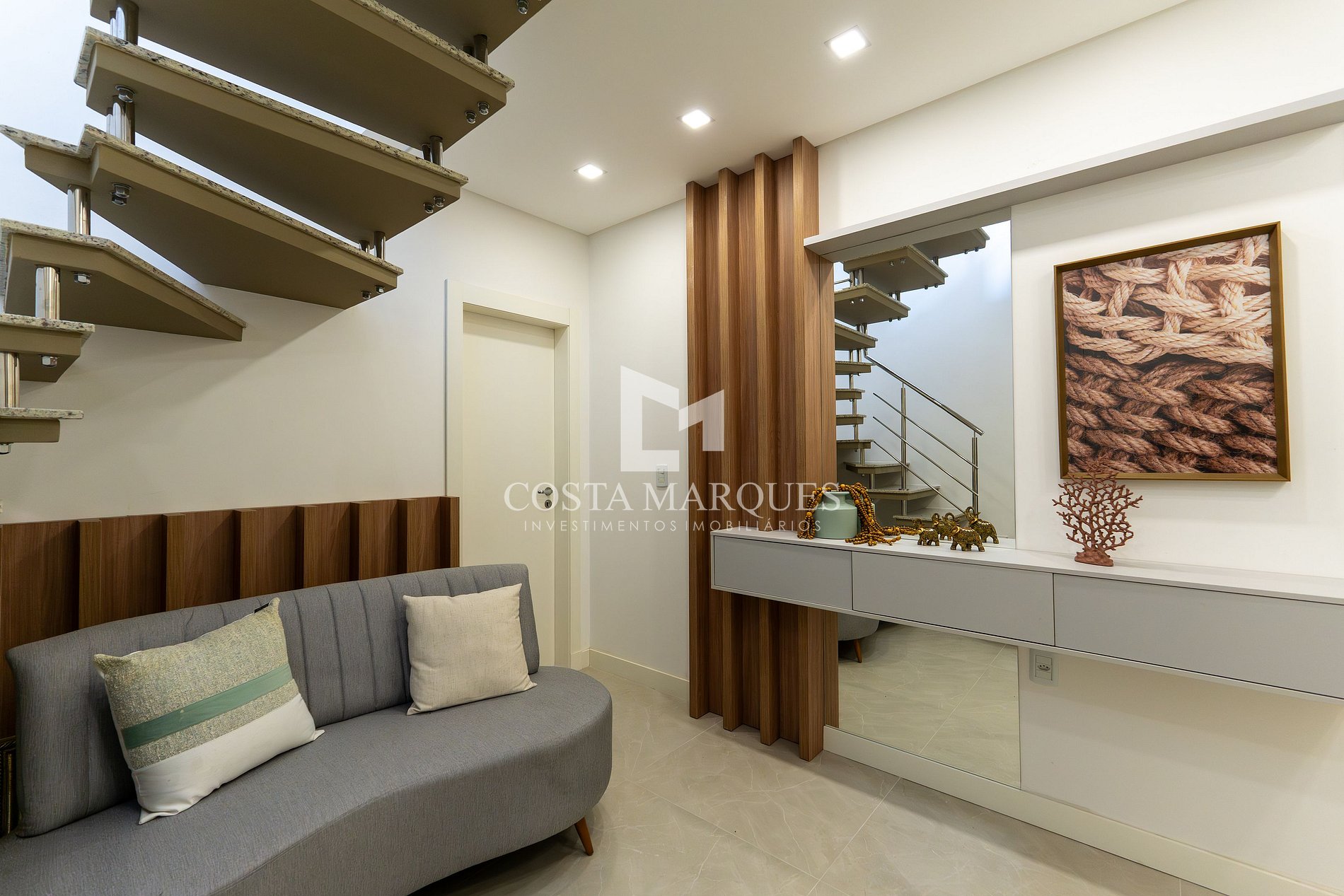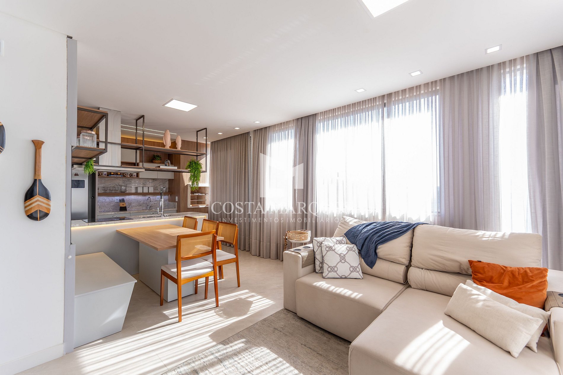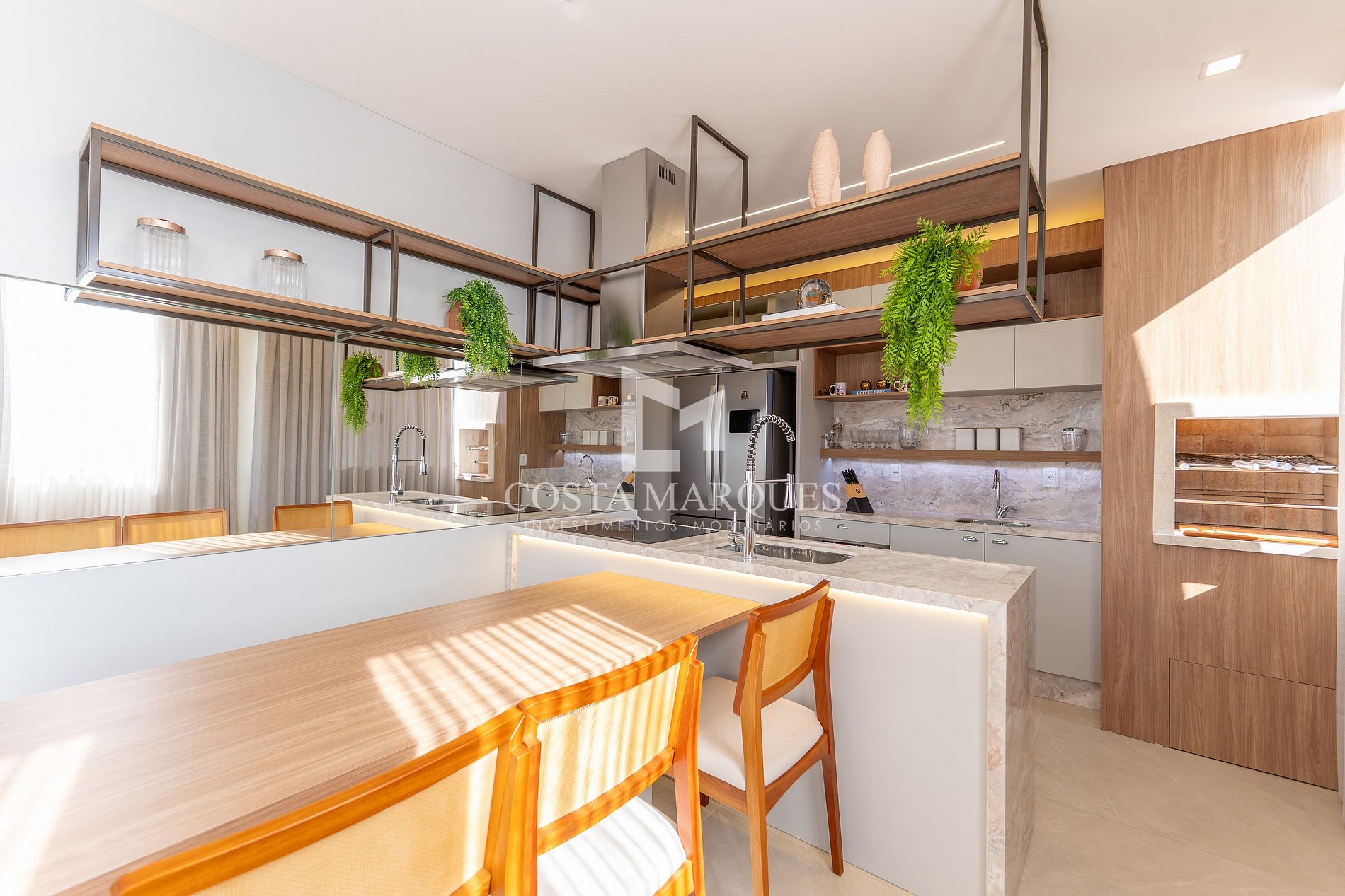Sala de estar e jantar integradas com churrasqueira